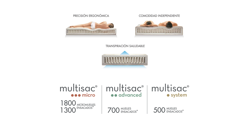 Pioneros en el uso del sistema de muelle ensacado a nivel nacional, cuentan con la colección más especializada del mercado en este sistema de descanso, nº1 en Europa. Gracias a su constante innovación tecnológica, ofrecen productos y soluciones hoteleras con diferentes gamas y niveles de confort a un precio altamente competitivo. La adaptación ergonómica y la transpirabilidad son dos de las claves de sus colchones, que aseguran un perfecto descanso.